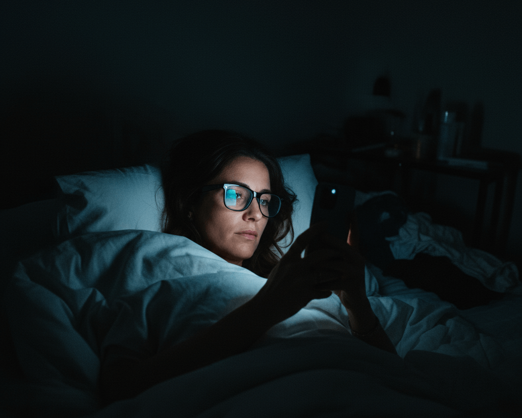 Glasses designed for late-night phone use — when the room is dark and your screen is still on.